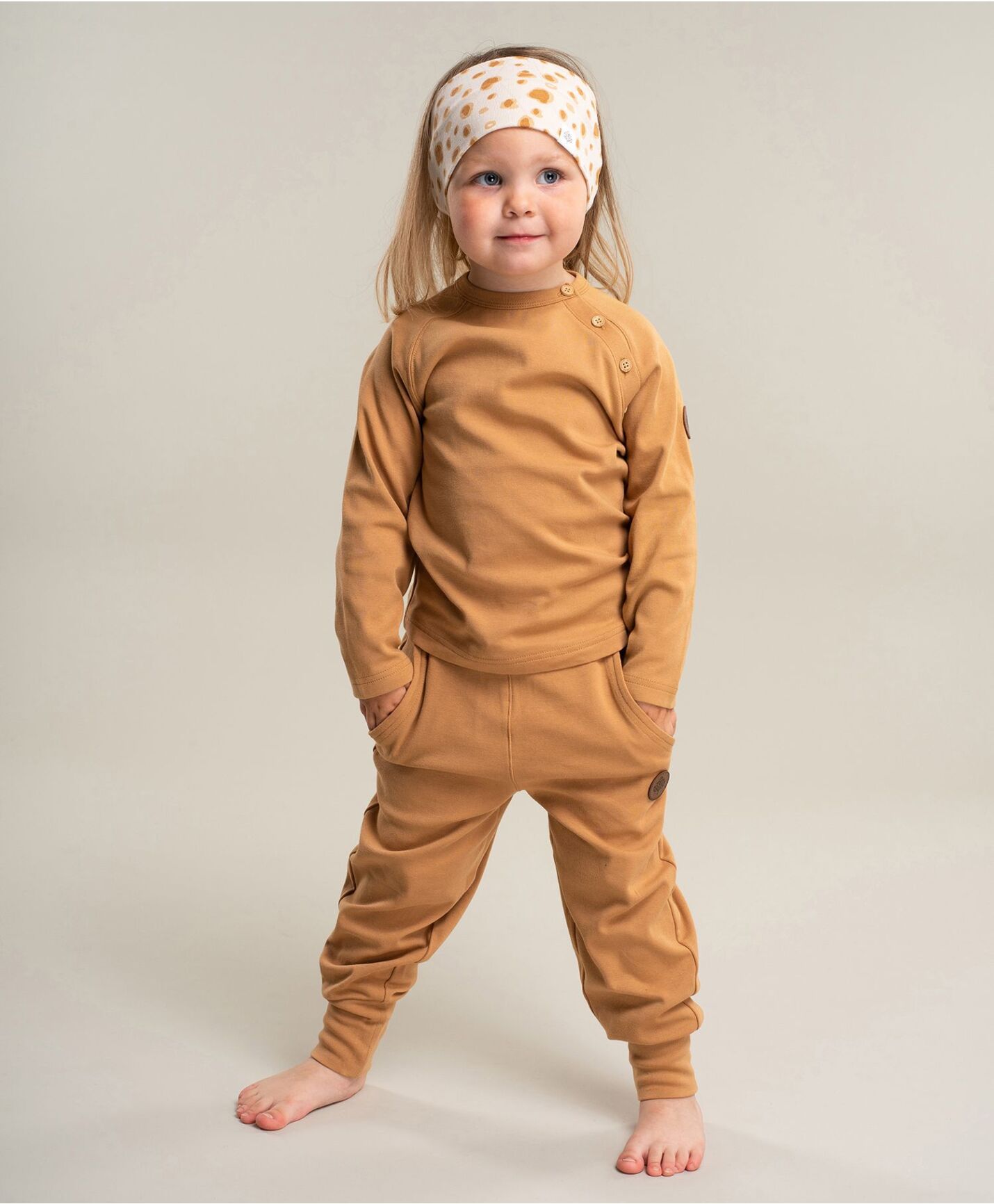 Dette er en super bukse til bruk i hverdagen. Den er myk, og løs i modellen som gir god bevegelighet og stretch. Knyting i livet og elastisk strikk rundt hele midjen. Finnes med matchende overdel, og passer perfekt til bruk i barnehagen eller på skolen. Holder seg utrolig godt i vask, og kan arves mellom barna. Et av Gullkorn Designs mest solgte plagg, og vi oppfordrer kundene våre til å velge farge etter barnas personlighet Materialegenskaper: 96% bomull, 4% elastan 200 GSM Øko-Tex 100 sertifisert