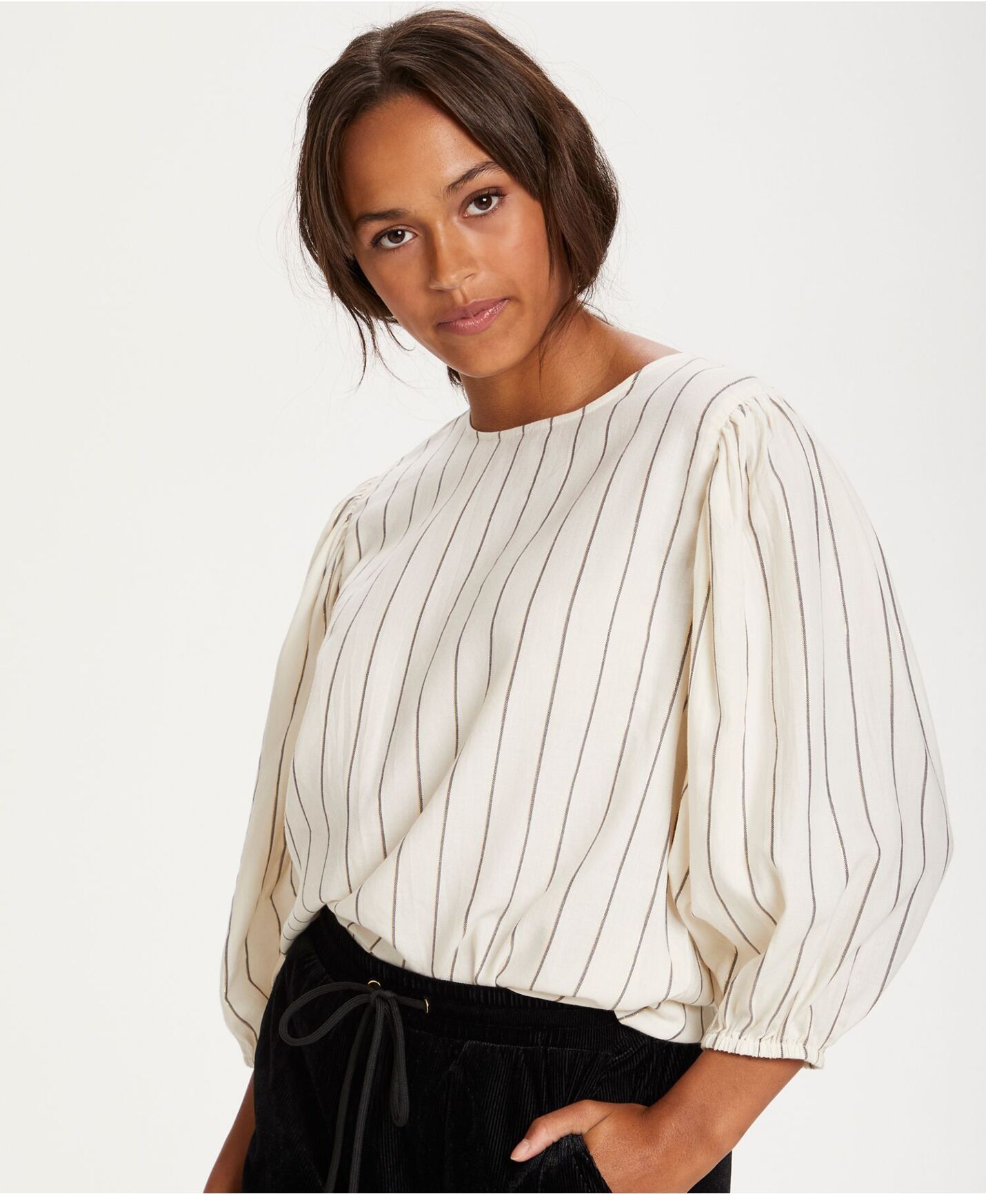 Søt bluse fra kaffe med ekslusive look. Herlig viskosekvalitet med tynn metalisk tråd som gir et lekkert utseende. Ledig modell, men elastikk i ermavslutning og rett i nedkant. 97% viskose 3% lurextråd. Vask 30ºC
