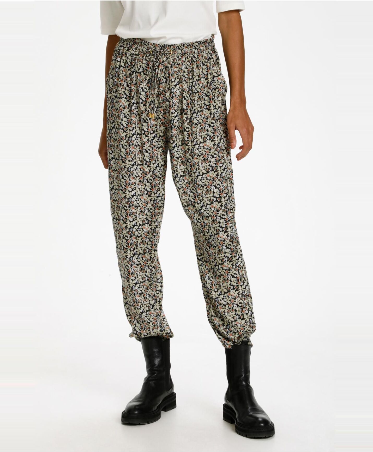 Bukse fra Kaffe i herlig 100% viskosekvalitet. Buksen har stikklommer i siden, elastikk i midjen og i nedkant. Strammesnor i midjen.