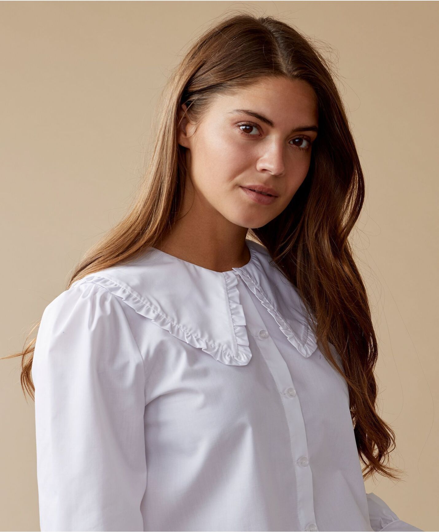 Søt bluse med stor blondekrage. Knepping i front og i mansjett. Lett buet i nedkant. 80% polyester,20% bomull