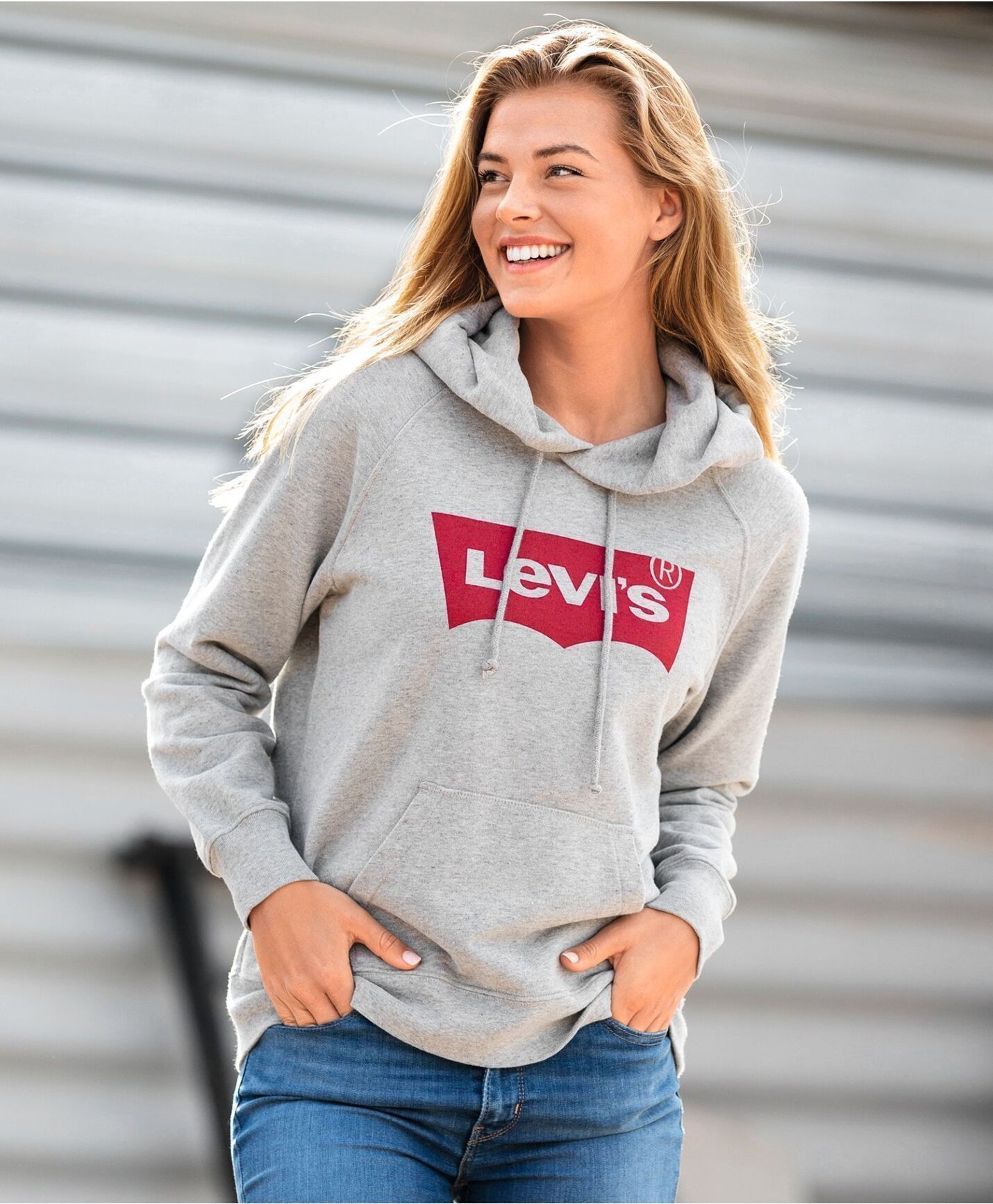 Lekker hettegenser fra Levis til dame. Stort Levi's trykk i front og munkelomme. Genseren har fast hette med strammesnor, ribb i nedkant og ved ermavslutning.