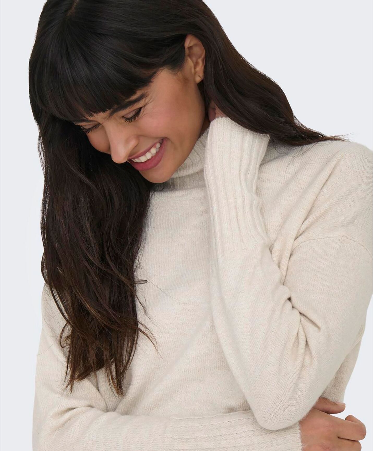 Only Gabriel høyhalset strikket genser med drop shoulder. Ribbet strikk i nedkant og rundt håndledd, samt halsen. 97% polyester, 3% elastan