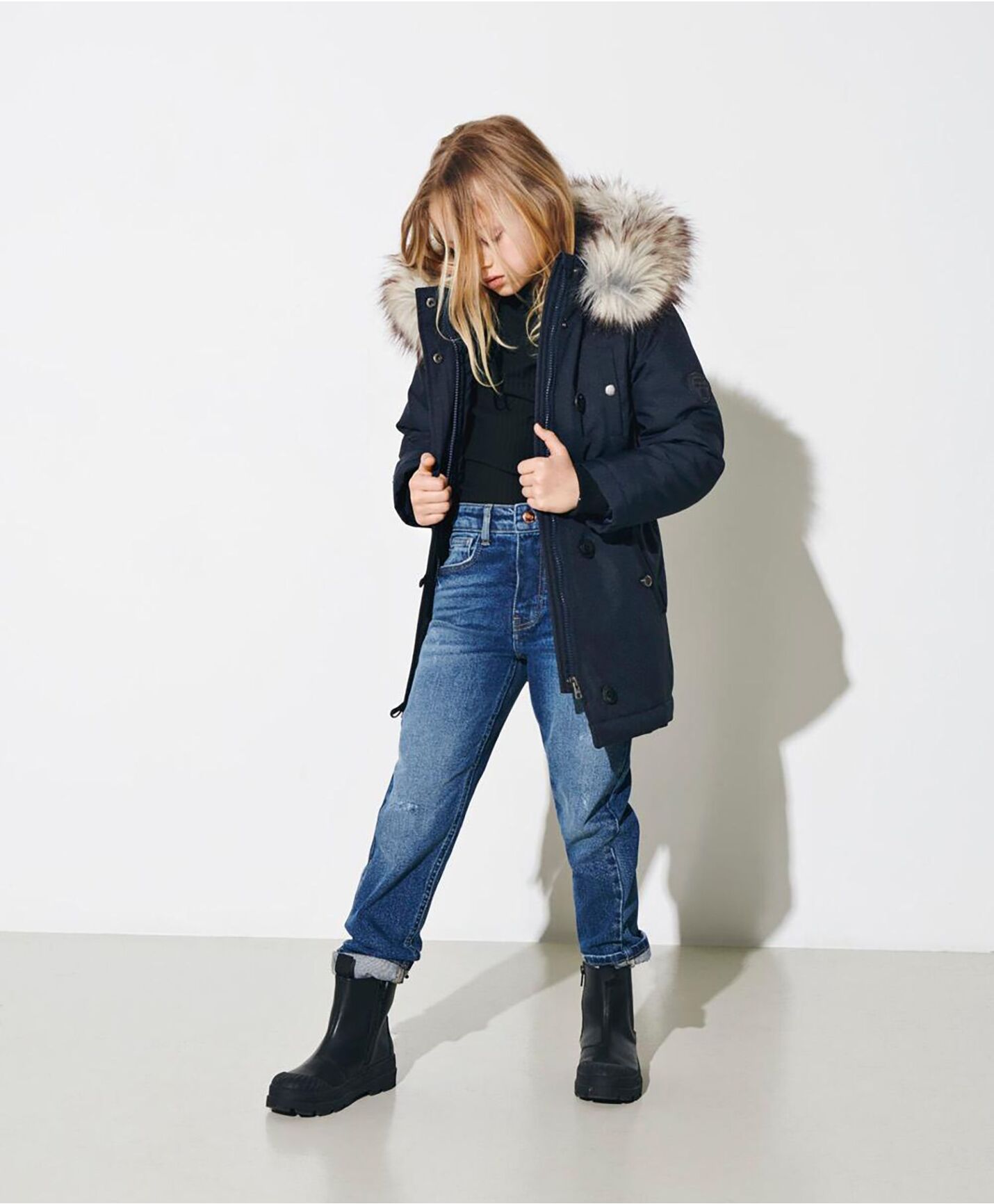 - Glidelås under en beskyttende vindstolpe, lukkes med både trykknapper og vanlig knapper.