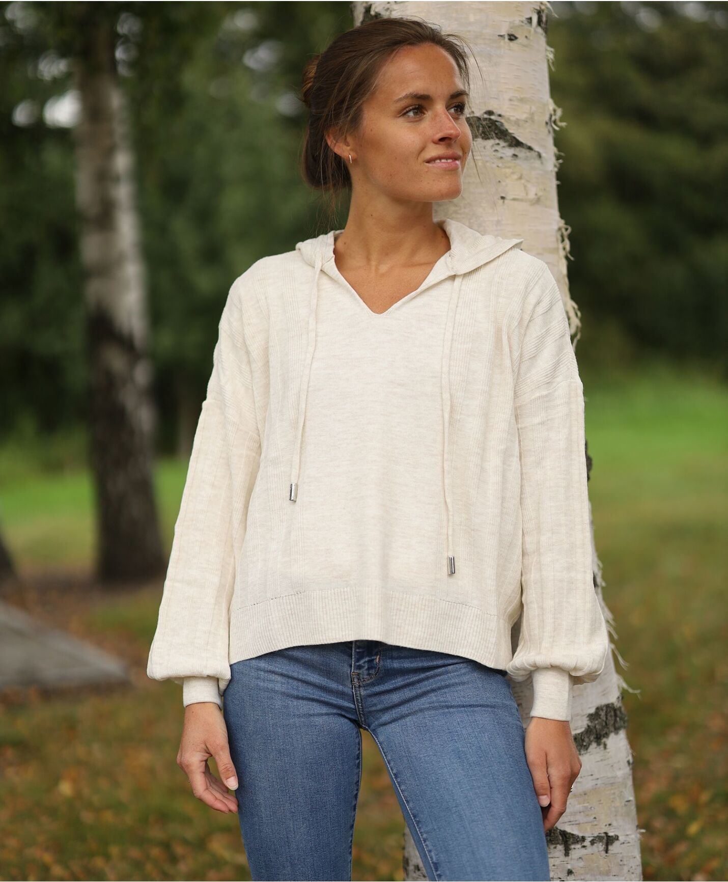 Strikket V-halset hettegenser med løs passform. Lange vide ermer med elastik ribb ved håndledd. Lengde: 55 cm i str. S. 100% AkrylKjøp nå - betal senere: