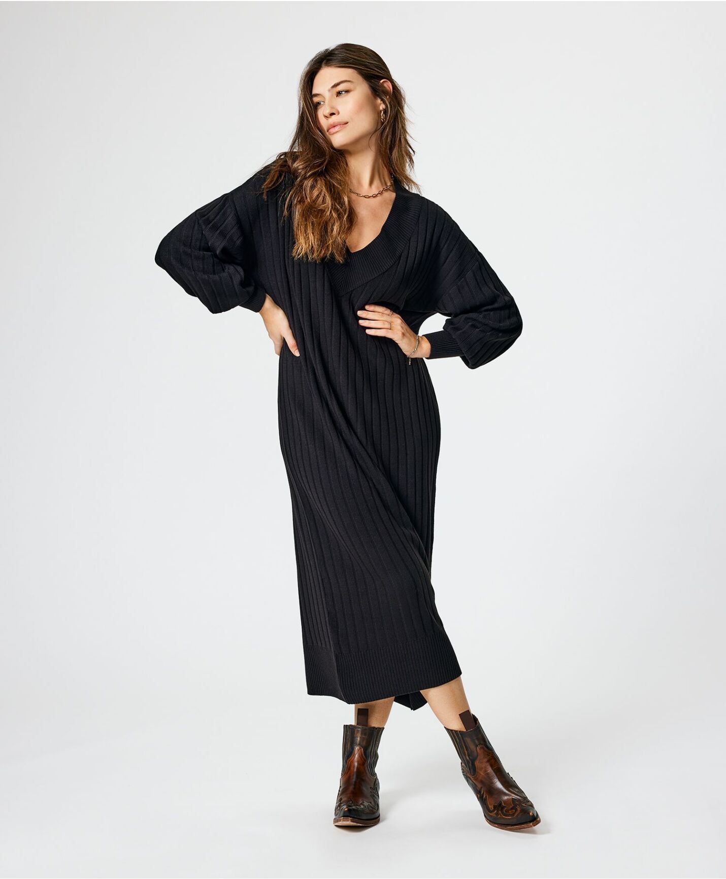 Lang herlig strikket kjole med lange ermer og V-hals. Lengde: 122 cm i str.S. Finvask 30ºC. 100% AkrylKjøp nå - betal senere: