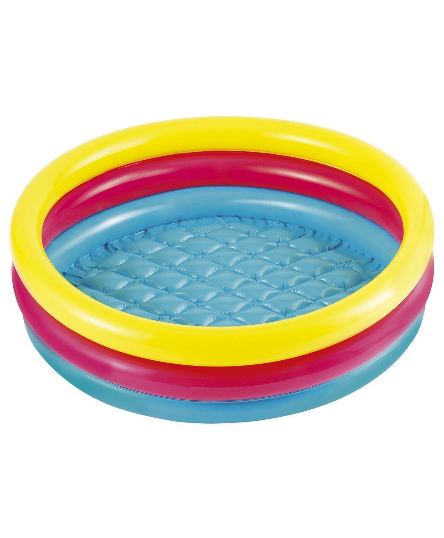 Plaskebasseng for den minste, 86x86x25cm. De 3 oppblåsbare ringene i friske farger lyser opp på gressplenen, og den oppblåsbare bunnen gjør at det er behagelig for de minste å sitte i bassenget.