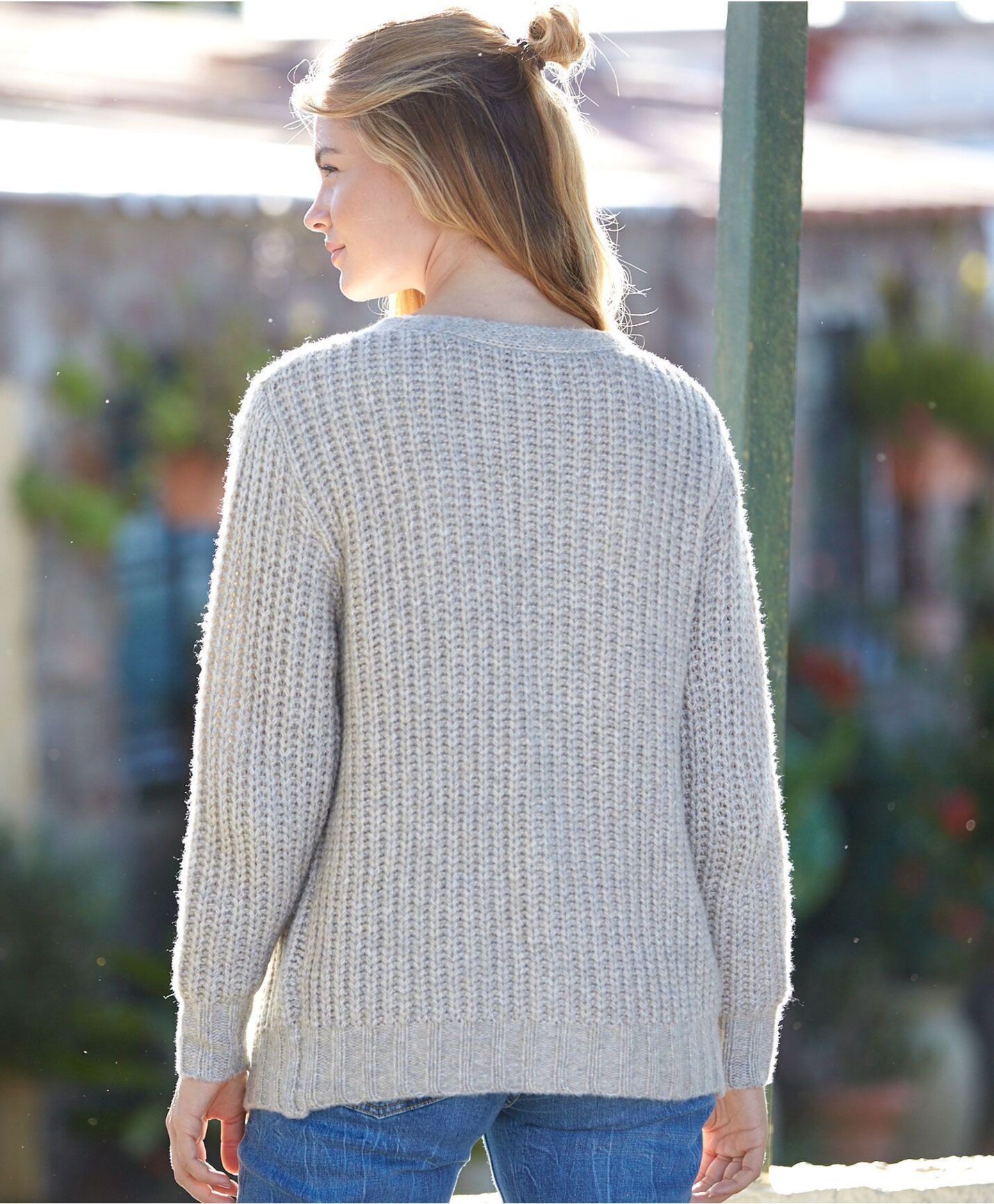Strikket cardigan i nydelig beige farge, med v-vals, flettede detaljer og knepping i forkant. Strikket ribb i nedkant og ermeavslutning. Nydelig kvalitet i 50% acryl, 40% nylon, 3% ull og 7% polyester.