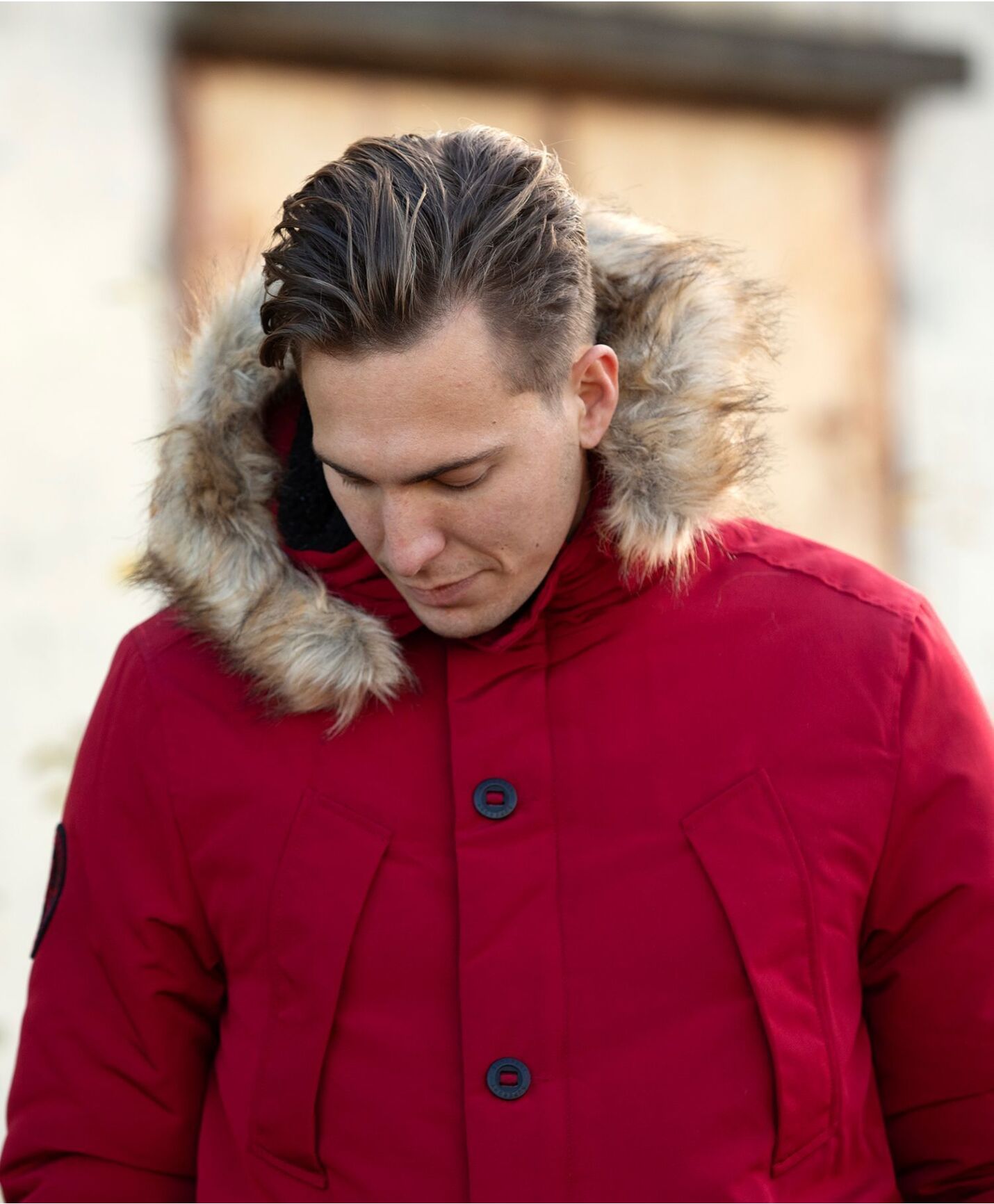 - Vattert herre jakke med fast hette og fuskepels samt deilig fleecefôr.